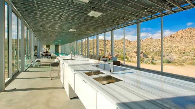 Khi vào bên trong, các cửa sổ lớn từ trần đến sàn càng làm xoá tan sự khác biệt giữa trong nhà và bên ngoài. Công trình độc đáo này được đúc hẫng ở độ cao khoảng 30 m và quay mặt về hướng Tây để những người bên trong có thể trải nghiệm toàn bộ cảnh hoàng hôn trên sa mạc.
