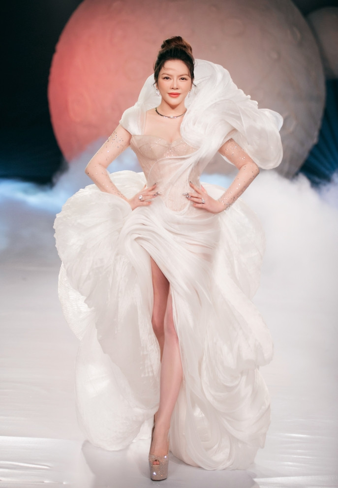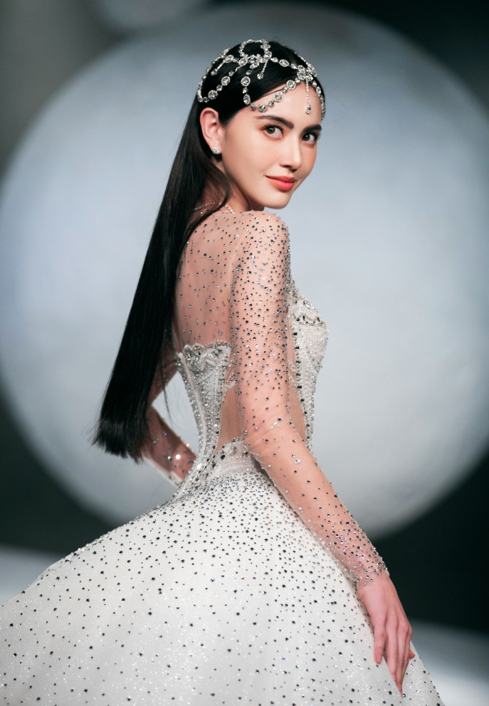 "Ma nữ đẹp nhất Thái Lan" mặc bộ váy cưới lộng lẫy do Lan Khuê thiết kế. Cô catwalk nhẹ nhàng, tinh tế với gương mặt xinh đẹp như nữ thần.