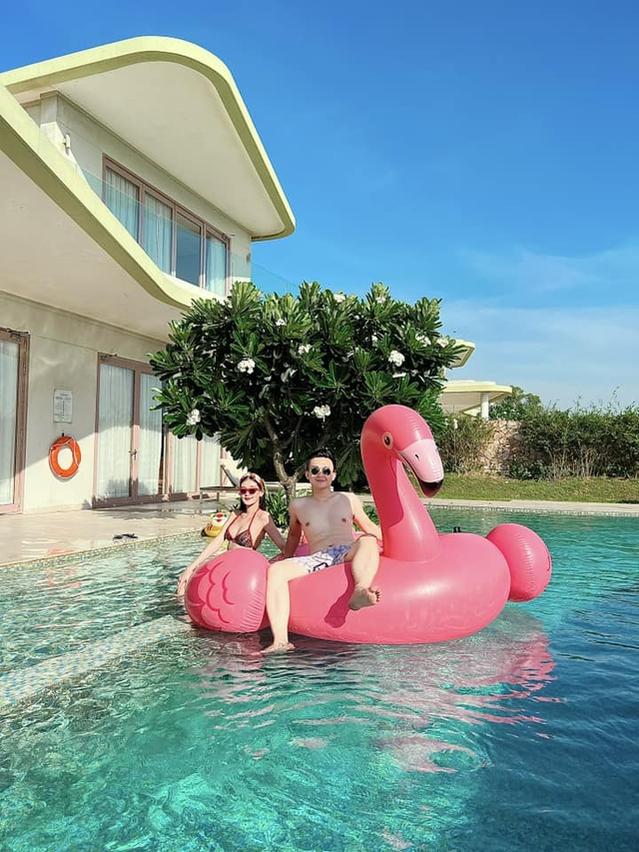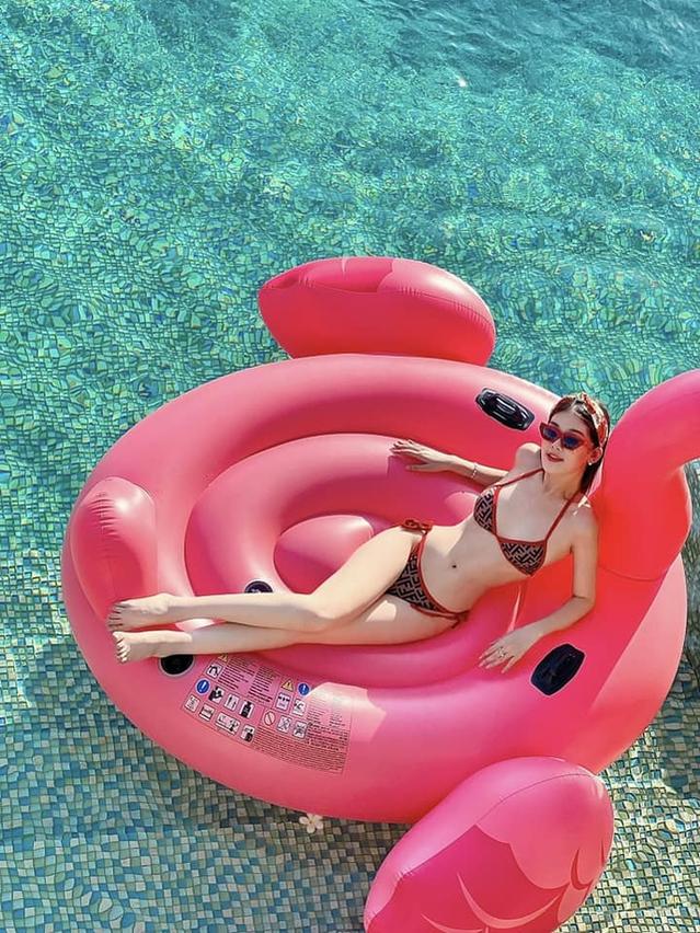 Cùng với loạt ảnh này, người đẹp viết: "post vài tấm hình với không khí thư thả cuối tuần. Lúc này là bé bi TiNo gần 4 tháng tuổi đang lấp ló trong bụng, còn giờ tui vẫn chưa thử mặc lại bikini".