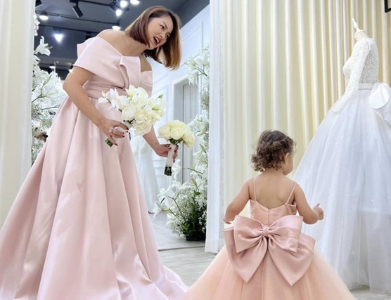 Nữ diễn viên liền lên tiếng cho biết chưa có chú rể, chỉ là đang thử váy cùng con gái
