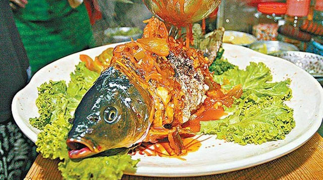 Cuối cùng, cá được đặt cẩn thận trên đĩa, rưới nước sốt chua ngọt ngập phần thân đã chiên giòn để phục vụ thực khách. Đầu bếp đảm bảo rằng cá không còn sống, phần thân đã chín hoàn toàn, những cử động của mang hay miệng chỉ là hiện tượng co thắt thần kinh không kiểm soát.