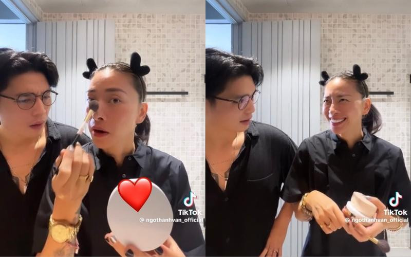 Cụ thể khi vợ chồng nữ đạo diễn đang cùng nhau sửa soạn diện mạo trước gương, Ngô Thanh Vân đã sử dụng phấn phủ để thoa lên mặt. Trước hành động này của vợ, Huy Trần không khỏi thắc mắc: "Cái này là cái gì vậy?". Người đẹp bình tĩnh trả lời: "Cái này phấn làm cho mặt vợ đừng có bóng".