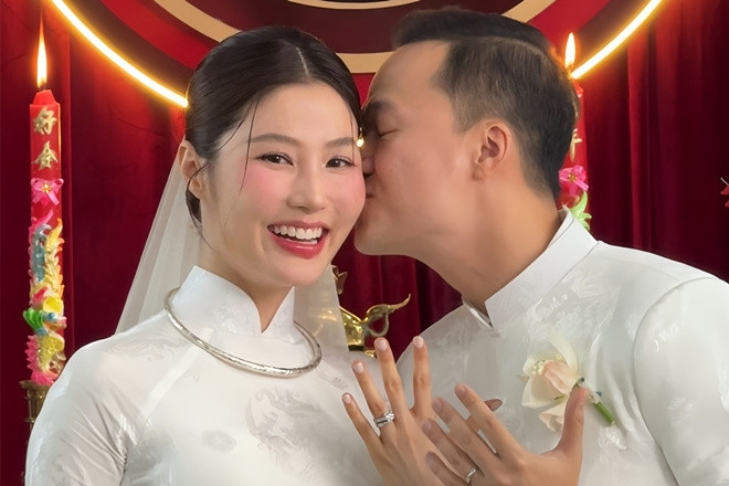 Mẹ Vinh Nguyễn tặng và tự tay đeo trang sức cho Diễm My. Vợ chồng diễn viên hôn má nhau trong tiếng hò reo, chúc phúc của người thân.