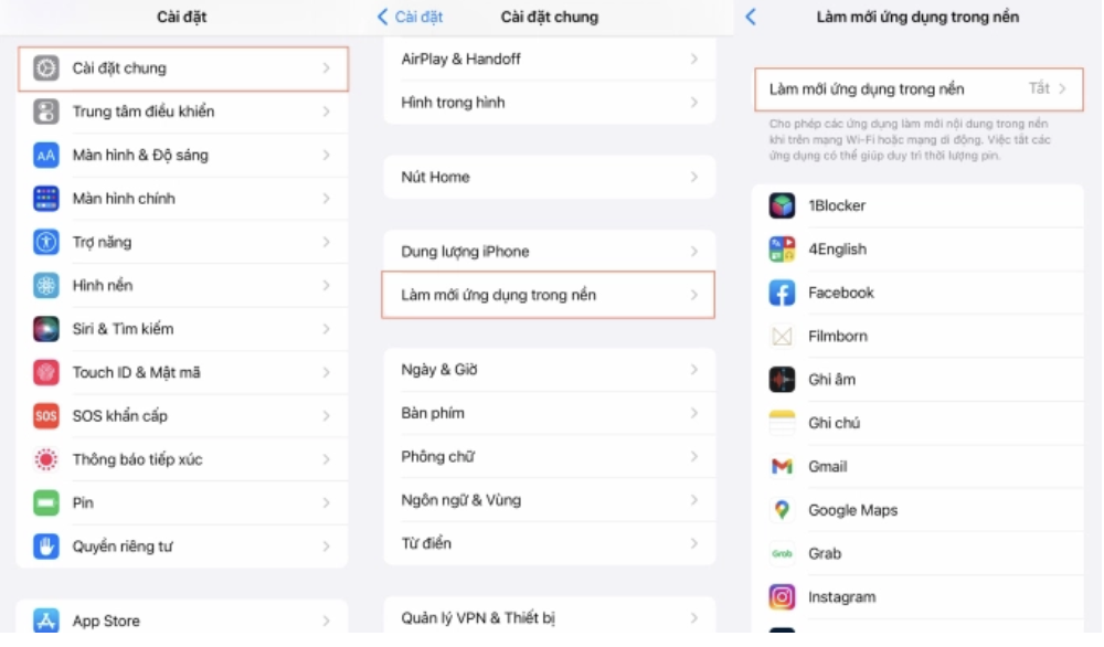 Người dùng có thể đi tới Cài đặt, nhấp vào Cài đặt Chung và tìm Làm mới ứng dụng trong nền. Sau đó, người dùng có thể lựa chọn tắt tính năng này riêng lẻ cho một số ứng dụng hoặc chung cho tất cả ứng dụng đang chạy nền dưới điện thoại.