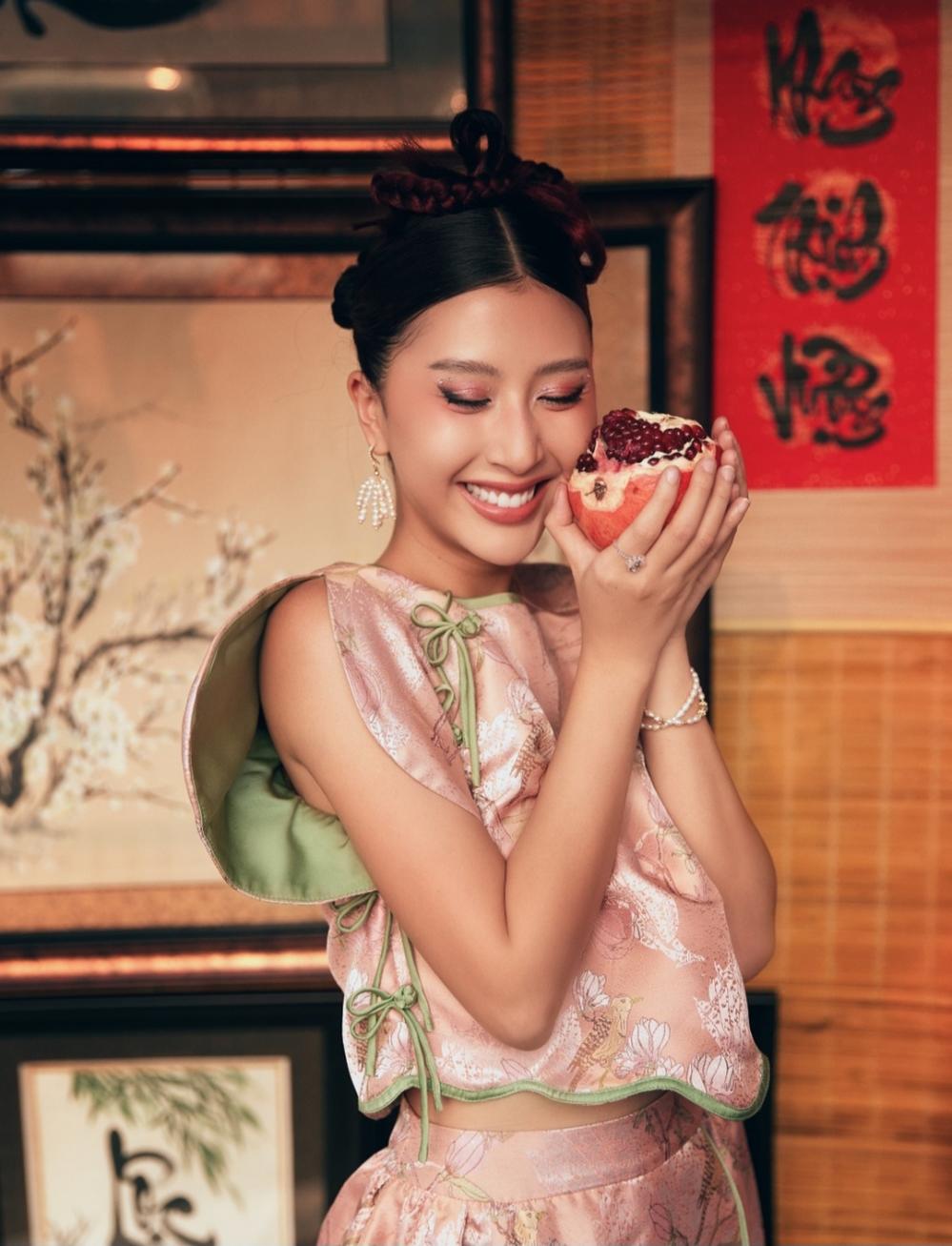 Trong bộ ảnh thực hiện cho dịp Tết Nguyên Đán 2024, Quỳnh Anh Shyn chứng minh khả năng biến hoá đa dạng với hình ảnh có phần nhẹ nhàng, trưởng thành hơn so với phong cách cá tính thường ngày. Lựa chọn trang phục gấm với hoạ tiết hoa văn tinh tế, sắc sảo và kiểu dáng cách tân từ phần cổ áo dài truyền thống, Quỳnh Anh Shyn khoe thần sắc yêu kiều, mang đến một cô gái truyền thống nhưng không kém phần hiện đại, trẻ trung.