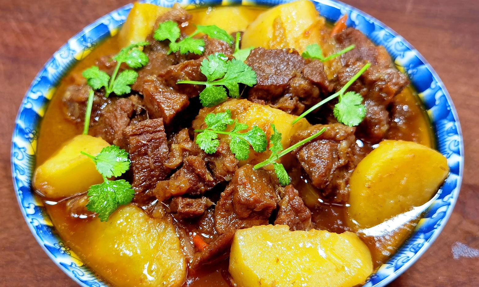 - Thêm khoai tây cắt khối, thêm lượng muối vừa ăn, đun nhỏ lửa cho đến khi thịt ḅ mềm và khoai tây chín quá th́ tắt bếp và xúc ra bát, trang trí với rau mùi rồi thưởng thức.