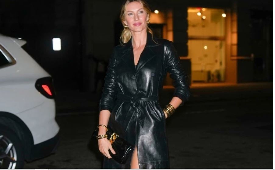 Trong khi đó, siêu mẫu Gisele Bundchen theo đuổi phong cách đơn giản. Cô mix-match bộ cánh chất liệu da cùng đôi boots đồng chất liệu, tôn chiều cao 1,8 m. WWD dành lời khen cho chiếc túi hình nơ mang đậm dấu ấn thời trang thập niên 1980 của nhà mốt Alexis Bittar. Ảnh: Glamour.