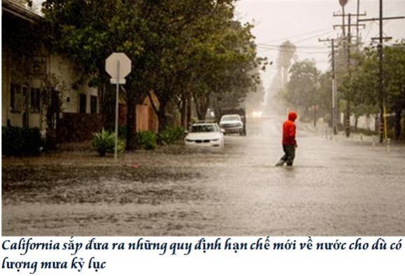 "dòng sông khí quyển" mạnh mẽ kéo theo những cơn mưa lớn đã đem lại cho California một số lượng nước mưa đạt kỷ lục kể từ hôm 04/02, vốn càng làm cho tiểu bang này thêm ẩm ướt sau một năm đầy ẩm cho đến thời điểm hiện tại, nhưng nhiều thành phố và quận có thể sẽ sớm bị buộc phải thực thi các biện pháp nhằm bảo tồn nguồn nước theo quy định do tiểu bang đề xướng.