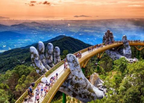 Khi đến Bà Nà Hills, điều đầu tiên du khách nhìn thấy là Cầu Vàng, một cây cầu dài 150m nâng đỡ bởi hai bàn tay to lớn, được làm từ sợi thủy tinh thiết kế trông giống như đá núi.