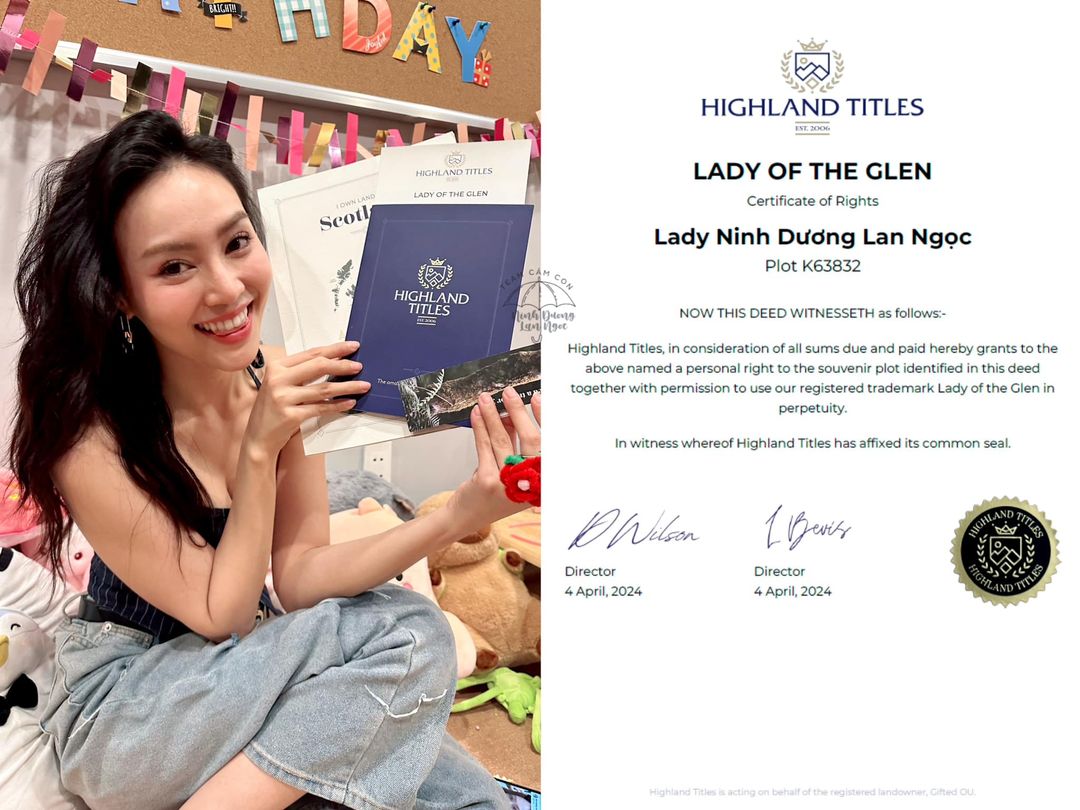 Chiều 5/4, Lan Ngọc gây sốt khi hé lộ món quà ý nghĩa trong dịp sinh nhật của mình. Cụ thể, nữ diễn viên đã được một người hâm mộ tại Scotland mua hẳn mảnh đất để tặng, kèm theo đó là giấy chứng nhận với danh hiệu Lady Of The Glen. Hành động này từ fan của người đẹp cũng khiến cộng đồng mạng trầm trồ.