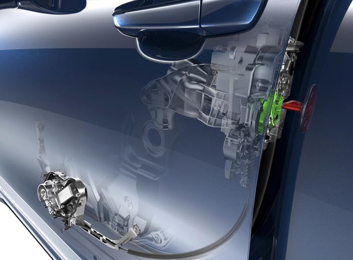 Bộ cửa hít ô tô gồm mô-tơ điện, bộ khóa cửa tích hợp cảm biến và dây cáp. Người dùng chỉ cần đẩy nhẹ để cửa vừa chạm vào móc khóa cố định trên thân xe, tín hiệu từ cảm biến sẽ kích hoạt mô-tơ kéo dây sập chốt khóa cửa lại.