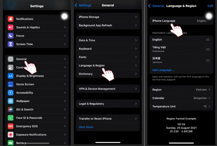 Bước 1: Truy cập vào "Settings" chọn "General" chọn tiếp "Language & Region" sau đó chọn "iPhone Language".