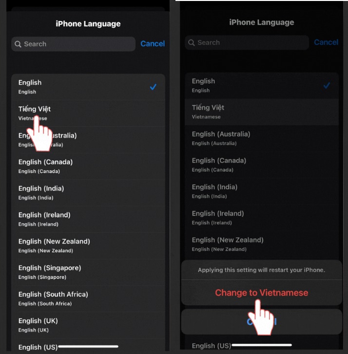 Bước 2: Tại giao diện "iPhone Language", bạn tìm kiếm ngôn ngữ Tiếng Việt (Vietnamese) nhấn chọn Tiếng Việt chọn "Change to Vietnamese". Sau đó, bạn vui lòng chờ máy thiết lập lại ngôn ngữ.