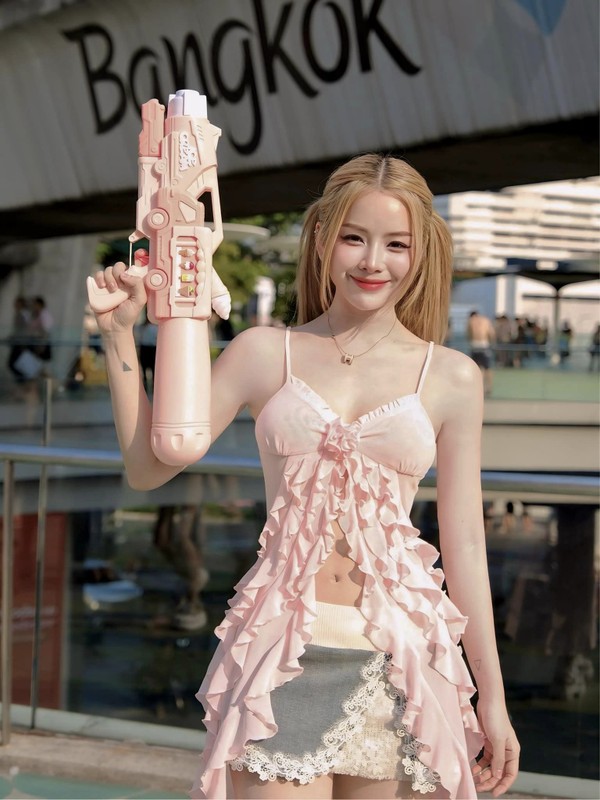 Mie diện chiếc áo 2 dây được thiết kế bèo nhiều tầng, cùng cây súng nước màu hồng "tone sur tone". Kết hợp cùng kiểu tóc được cột lên, Mie vừa nữ tính, vừa tinh nghịch năng động.
