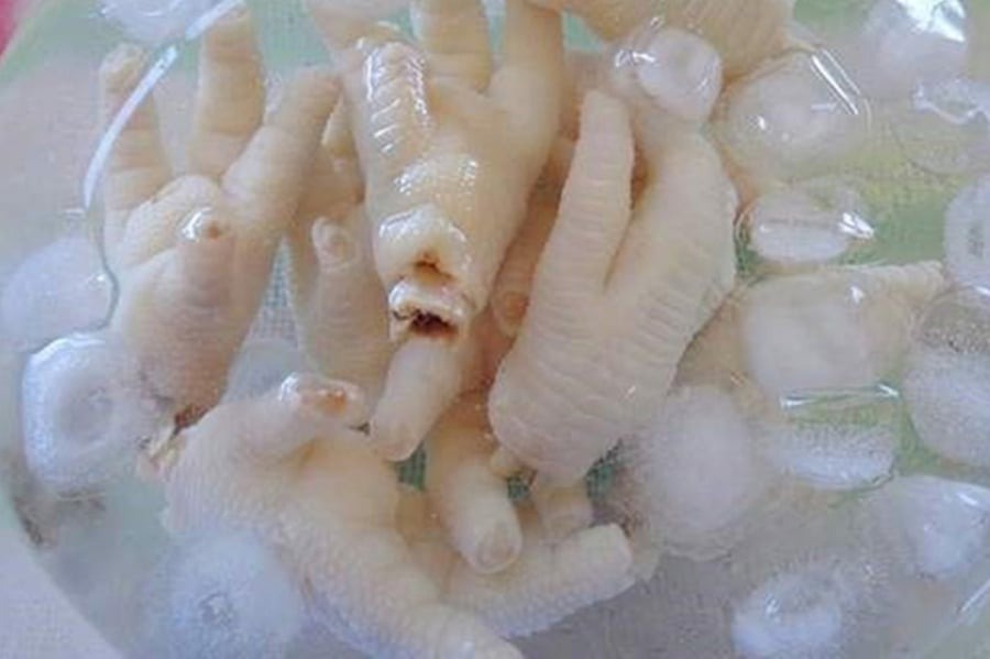Vớt ngay chân gà ra một bát nước đá có bỏ xíu muối và ngâm trong 10 phút.
