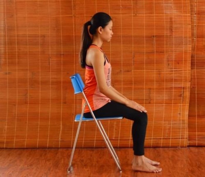 Ngồi trên ghế, hai chân đạp sàn song song và tách rộng bằng hông, hai tay đặt nhẹ lên gối, lưng giữ thẳng.