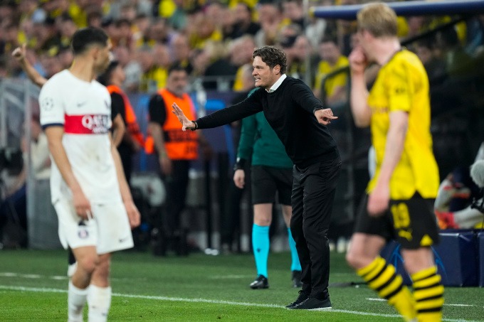 HLV Dortmund Edin Terzic chỉ đạo trong trận thắng PSG 1-0 ở lượt đi bán kết Champions League trên sân Westfalen, Dortmund, Đức ngày 1/5. Ảnh: AP