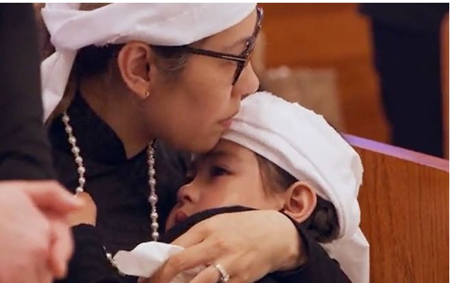 Bình Phương và con gái 4 tuổi trong lễ tang Đức Tiến.