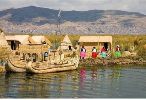 ‘ Nơi ở của người Uros là những hòn đảo nhân tạo được hình thành từ những câu sậy có tên là totora, mọc tự nhiên trên bờ hồ Titicaca.