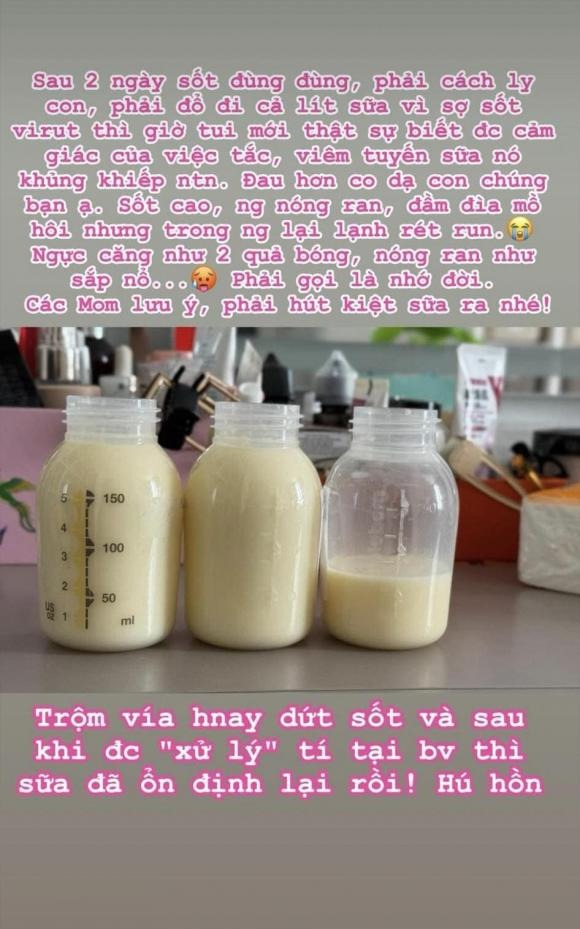 Cô chia sẻ: "Sau 2 ngày sốt đùng đùng, phải cách ly con, phải đổ đi cả lít sữa vì sợ sốt virut thì giờ tui mới thật sự biết được cảm giác của việc tắc, viêm tuyến sữa nó khủng khiếp như thế nào. Đau hơn co dạ con chúng bạn ạ. Sốt cao, người nóng ran, đầm đìa mô hôi nhưng trong người lại lạnh rét run. Ngực căng như 2 quả bóng, nóng ran như sắp nổ. Phải gọi là nhớ đời. Các mẹ lưu ý phải hút kiệt sữa ra nhé. Trộm vía hôm nay dứt sốt và sau khi được "xử lý" tại bệnh viện thì sữa đã ổn định trở lại rồi. Hú hồn".
