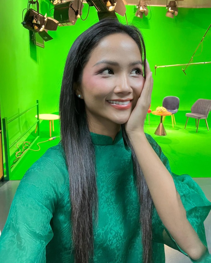 H'Hen Niê chọn áo dài xanh hoa gấm tương đồng với phông xanh trong trường quay.