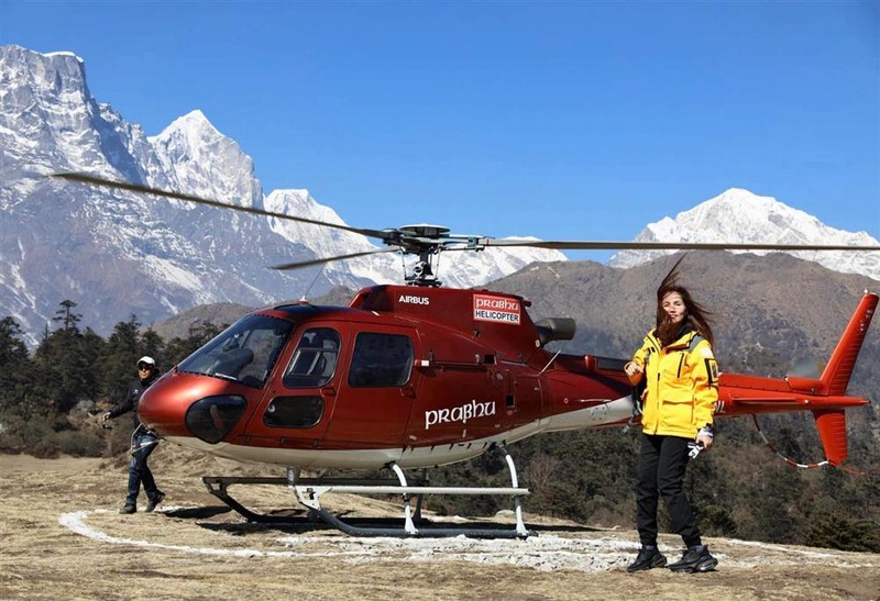 Chị Thúy Anh bên chiếc trực thăng vừa hạ cánh xuống sân bay Lukla. Ảnh: Hoàng Thúy Anh