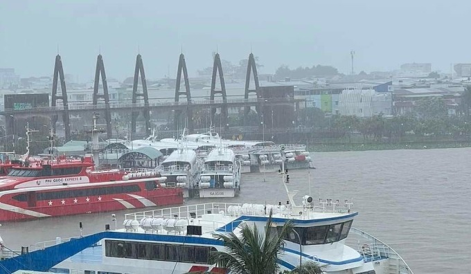 Bến tàu TP Rạch Giá mưa lớn, tàu tạm dừng nhiều chuyến ra đảo. Ảnh: Mỹ Lệ