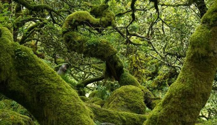 Wistman's Wood nổi tiếng với những cái cây có hình dạng kỳ lạ, xoắn xuýt, xương xẩu, được bao phủ bởi các lớp rêu, địa y và đứng giữa một khu vực gập ghềnh của những tảng đá granit. Ảnh: 121clicks