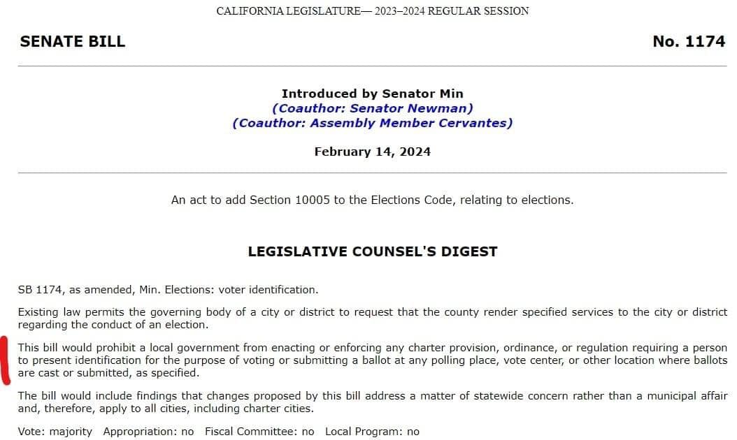 Hôm nay quốc hội California đã thông qua một dự luật. Cấm hỏi căn cước khi đi bầu cử. Newsom sẽ ký luật này sớm cho kịp cuộc bầu cử năm nay.