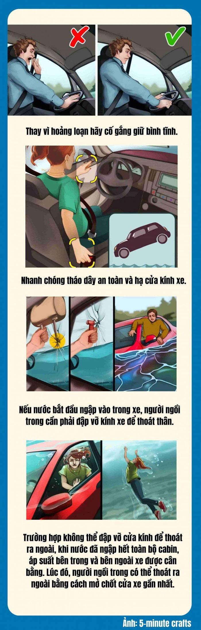 Bình tĩnh, nhanh chóng tháo dây an toàn, hạ cửa kính, thoát ra ngoài là những điều cần làm để thoát hiểm trong gang tấc khi ô tô không may rơi xuống nước.
