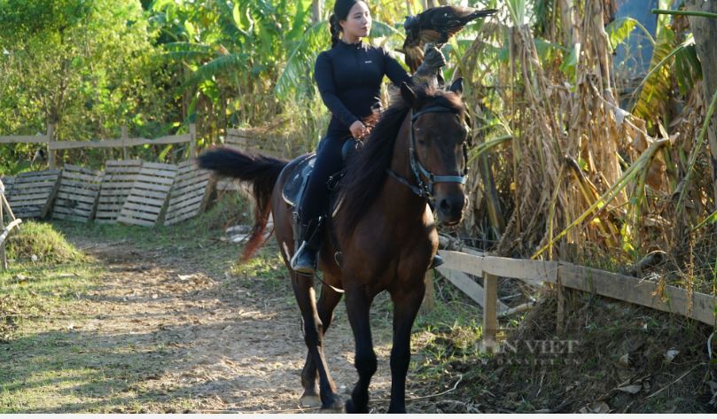 Chị Quỳnh thực hiện động tác nâng cao vừa cưỡi ngựa, vừa cầm chim tại sân tập. Ảnh: Trung Hiếu.