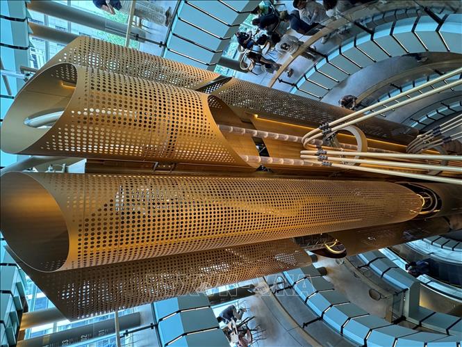 Cụm ống kim loại khổng lồ đứng sừng sững ở giữa tòa nhà với chiều dài lên đến 1,7km để đưa hạt cà phê rang đi khắp 5 tầng của tòa nhà.