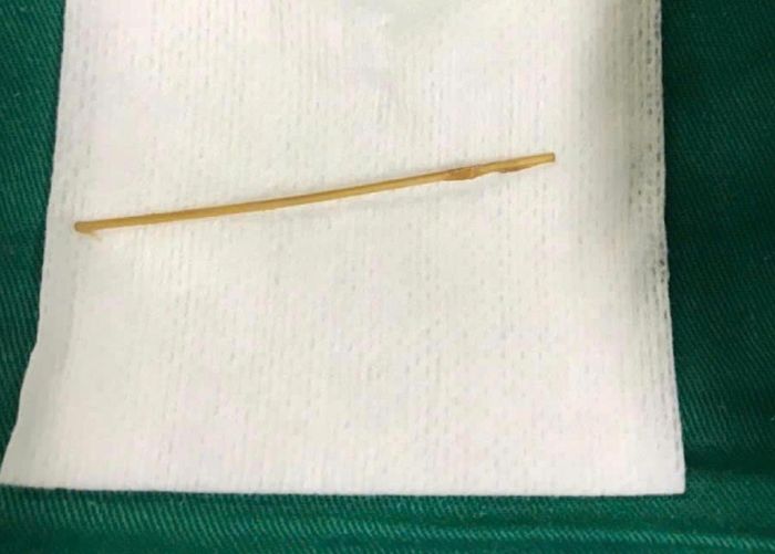 Trong qua trình phẫu thuật, các bác sĩ phát hiện dị vật là một tăm tre chọc thủng qua thành ruột của bệnh nhân