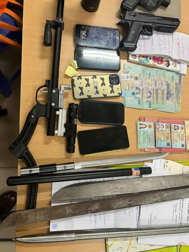Tiến hành khám xét nhà đối tượng, công an phát hiện và thu giữ một khẩu súng hơi, mã tấu cùng sổ ghi nợ và nhiều thẻ CCCD, sổ hộ khẩu của nhiều người dân.