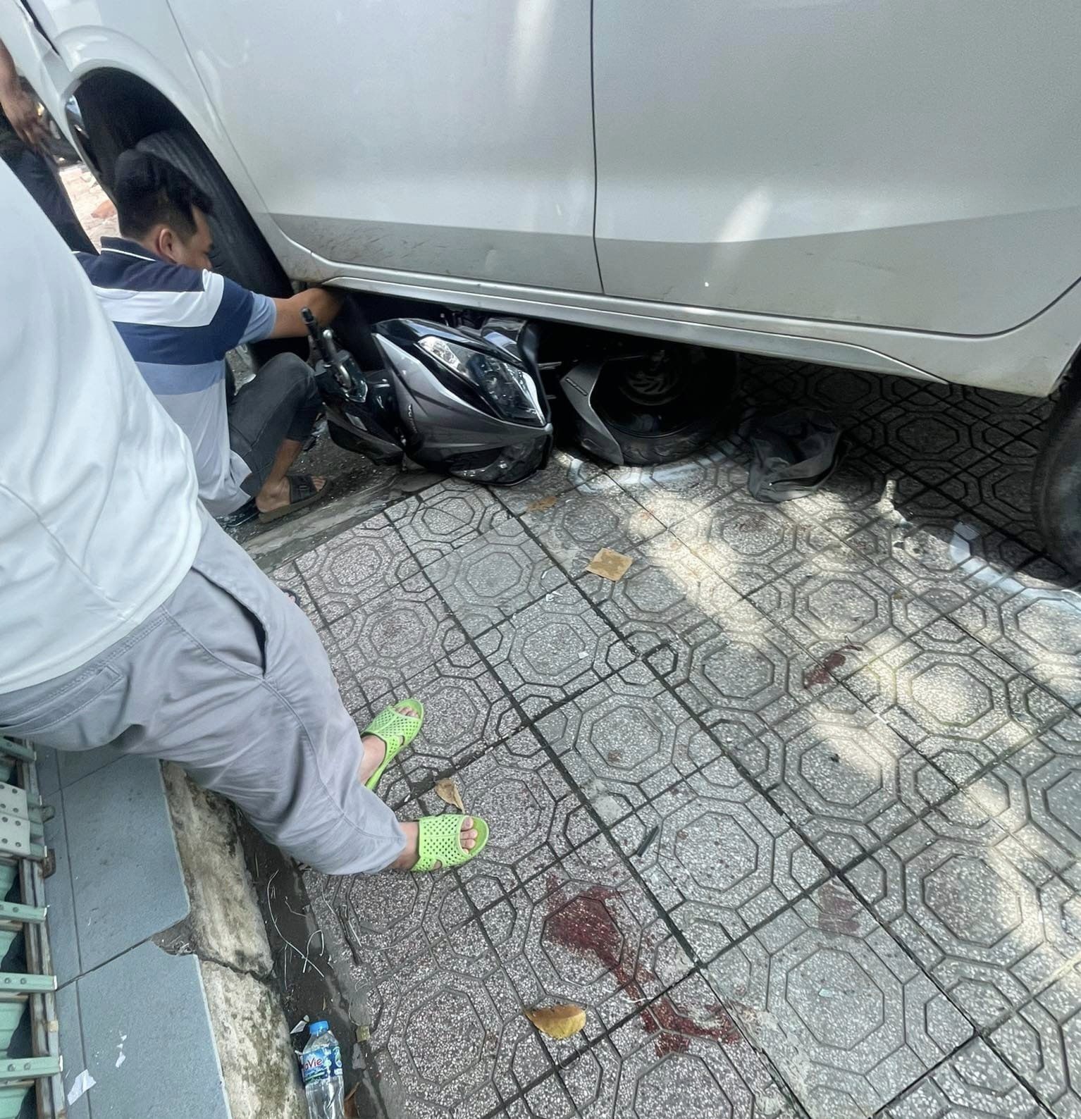 Một xe máy nằm dưới gầm ô tô. Ảnh: N.B.H.