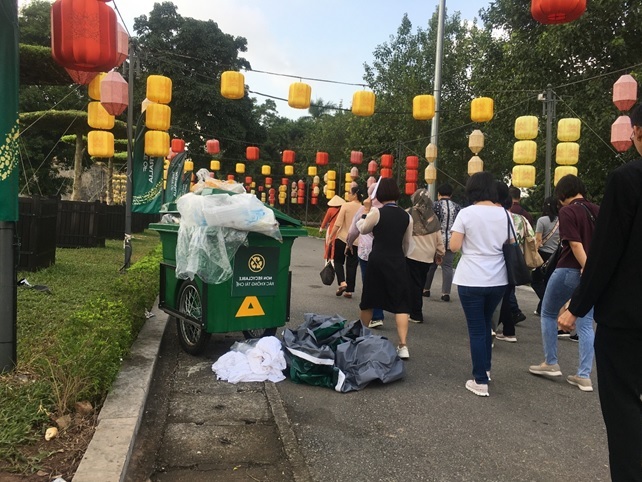 Rác thải từ sự kiện vừa qua vẫn còn nằm ngổn ngang, tạo thành một "bãi rác" ngay lối dẫn vào khu di sản. Không chỉ là các chai nhựa, túi nilon, mà còn có cả thức ăn thừa, giấy ăn vứt bừa bãi khắp lối đi. Mùi hôi bốc lên nồng nặc khiến nhiều du khách, cả trong và ngoài nước, phải bịt mũi khi đi qua.