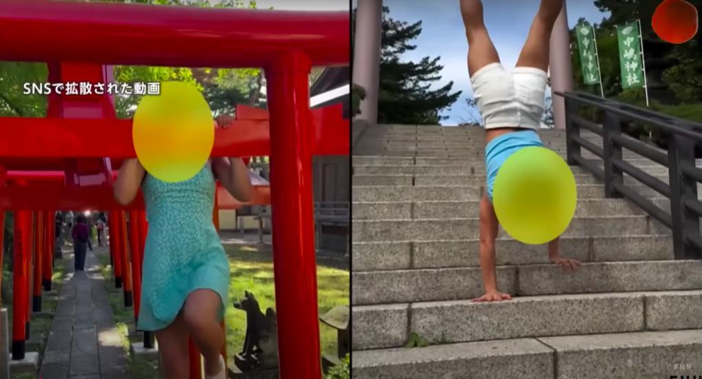 Giữa tháng 10, mạng xã hội Nhật Bản dậy sóng với đoạn video ghi lại cảnh hai nữ du khách tập những động tác thể dục dụng cụ trước cổng đền ở Sapporo. Một người đu mình lắc lư trên cổng Torii. Người còn lại trồng cây chuối, đi bằng tay tại khu vực bậc thềm trước đền.
