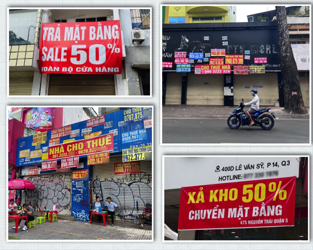 Những con đường chuyên kinh doanh tại SG tiếp tục rơi vào cảnh ế ẩm khi nhiều chủ cửa hàng cứ lần lượt bỏ đi, để lại mặt bằng với chằng chịt những tờ quảng cáo cho thuê mặt bằng xanh đỏ dán khắp mặt tiền.