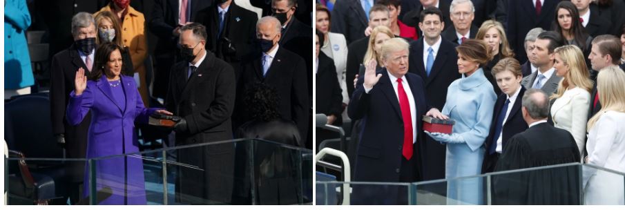 Bà Harris tuyên thệ nhậm chức phó tổng thống năm 2021 và ông Trump tuyên thệ nhậm chức tổng thống năm 2017. Ảnh: New York Times.