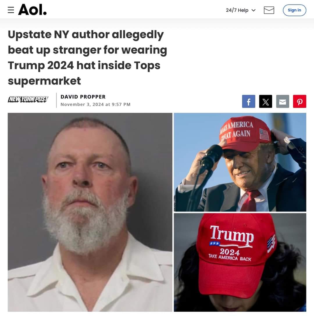 -Theo Cảnh sát ở village of Bath, New York cho hay : Một người ủng hộ Kamala Harris 60 tuổi tên là Robert Yott vừa bị bắt bởi cáo buộc đánh một cử tri của Trump tại Tops Friendly Markets vào khoảng 10 giờ sáng thứ Sáu vì người này đội mũ ủng hộ Trump 2024. Robert Yott đã đánh gãy răng nạn nhân và bỏ mặc anh nầy nằm trên sàn nhà giữa chợ . Yott đã bị bắt và bị buộc tội tấn công cấp độ hai, trọng tội và phá hoại tài sản cấp độ bốn.