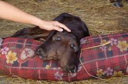 Chú bê 2 đầu vừa chào đời đã nằm bẹp dí xuống nền rơm, bên cạnh bò mẹ. Lúc này vợ chồng chị Phụng đành pha sữa vào bình cho nó uống với hi vọng 1-2 giờ đồng hồ sau có thể đứng dậy. Nhưng suốt 18-20 tiếng, nó vẫn nằm nguyên, chẳng thể ngóc đầu lên nổi. "Nhà tôi nuôi con bò này được mấy năm, trước đó đã sinh 3 lứa, lứa nào cũng cho con khoẻ mạnh, chỉ vài tiếng là bê con có thể đứng dậy đi lại. Vì thế tôi rất mong bê 2 đầu cũng vậy nhưng nó yếu quá, mãi chẳng đứng dậy được”, chị Phụng tâm sự.