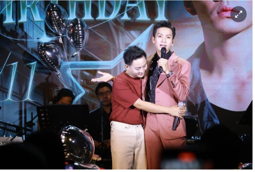 Hoài Lâm xúc động, ôm Bạch Công Khanh trong sinh nhật của đồng nghiệp. "Hôm nay, nhìn Lâm gầy hơn trước. Cách đây hơn một tuần, Khanh đang đóng phim ở xa, tự nhiên Lâm gọi cho tôi. Lúc đó khuya lắm rồi, tôi gọi lại cho Lâm vì không biết chuyện gì xảy ra. Lâm có hỏi tôi đang ở đâu và muốn gặp. Hai ngày trước, cả hai đi ăn chung. Nhưng không ngờ, Lâm bất ngờ xuất hiện tối nay", Bạch Công Khanh nói.