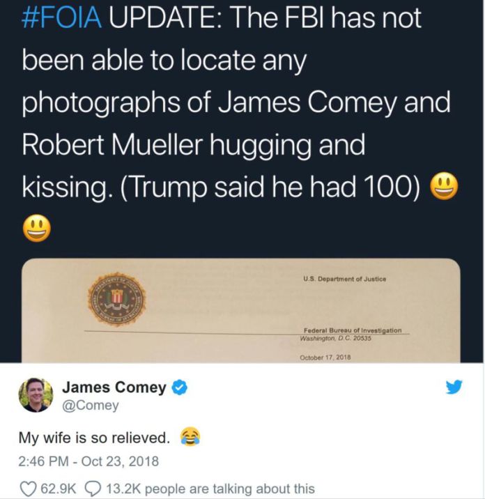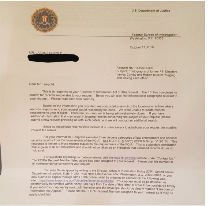 Theo bản tin của The Hill, ký giả Jason Leopold của BuzzFeed News hôm Thứ Ba, ngày 23 Tháng Mười, công bố qua Twitter thư trả lời của Bộ Tư Pháp Mỹ sau khi ông Leopold dùng Luật Tự Do Tin Tức (Freedom of Information Act – FOIA) để yêu cầu cơ quan FBI cung cấp các hình ảnh cho thấy hai ông Mueller và Comey “ôm và hôn nhau.”