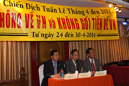 GS. Nguyễn Thanh Trang: Trước 1975, VNCH chúng ta chỉ cần 300,000 đô la viện trợ để sống còn, nay Việt Nam Cộng Sản được chúng ta gửi về một năm trên 10 tỷ đô la, làm sao chúng không sống? Tôi đề nghị xin các nhật báo chạy cho một banner nhỏ hàng ngày trên báo với nội dung: “Đừng về VN, đừng gửi tiền về VN.” Chúng tôi xin cám ơn tất cả các cơ quan truyền thông giúp đỡ chiến dịch này.