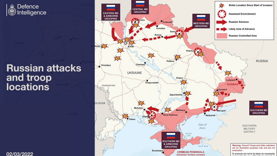 Vào ngày 2/3/2022 Kiev và Kharkov tiếp tục bị bao vây. Putin mệt mỏi, tức giận và tâm lý có vấn đề theo tình báo. Phương Tây tăng cường trừng phạt Nga và hỗ trợ Ukraina.