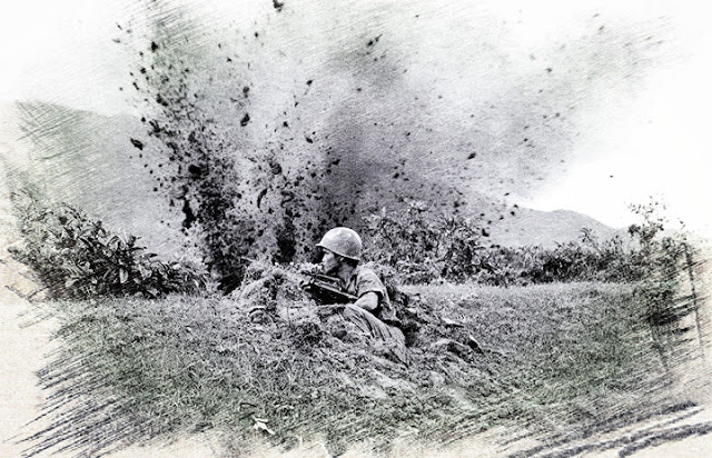Rồi hàng hàng lớp lớp Cộng quân tràn tới giữa tiếng ḥ la man dại “hàng sống, chống chết!” Đúng lúc này, các chiến sĩ Biệt Động Quân mới cắn răng siết chặt c̣ súng. Địch đă xâm nhập hàng rào kẽm gai pḥng thủ ngoài cùng, nhưng lập tức bị khựng lại v́ gắp phải bức tường lửa từ trong bắn ra rất chính xác. Xác địch chồng chất trên trận địa hay vất vưởng trên hàng rào kẽm gai. Nhưng địch quá đông, nhất định “dứt điểm” nên họ vẫn liều lĩnh xung phong.