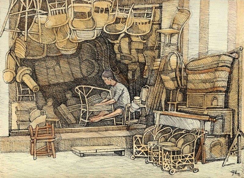Nam Kỳ, năm 1935. Tranh vẽ miêu tả một kiểu bới tóc tân thời của phụ nữ Nam Kỳ. Tóc được bới và bọc lại trong một túi lưới tròn. Ngoài ra (có thể) giắt thêm một khúc lược để giữ cho tóc không bị sút do chân tóc có sợi bị ngắn …