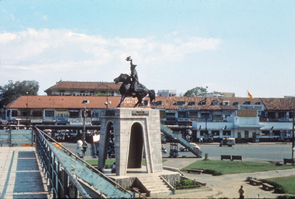 Saigon 1971 – Tượng đài Trần Nguyên Hăn nh́n từ trên cầu vượt dành cho khách bộ hành. Phía sau tượng đài nh́n thấy phần chân của cầu vượt bộ hành thứ hai từ bùng binh nối qua bến xe buưt. Nhà có mái ngói cao nhất trong h́nh là Nhà chú Hỏa, trên đường Phó Đức Chính.