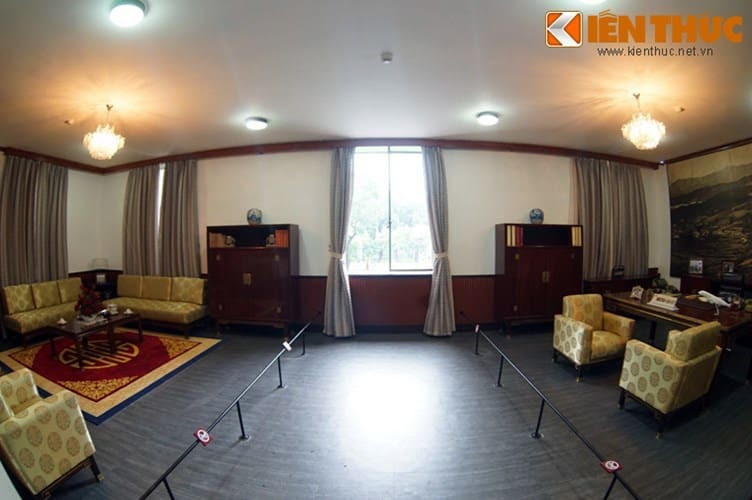 Bên phải căn phòng là nơi làm việc của ông Nguyễn Cao Kỳ với chiếc bàn làm việc khá lớn. Sau chiếc bàn là bức ảnh “Cao nguyên trung phần” (Tây Nguyên) của nhiếp ảnh gia Nguyễn Cao Đàm được in khổ lớn ốp lên tường.