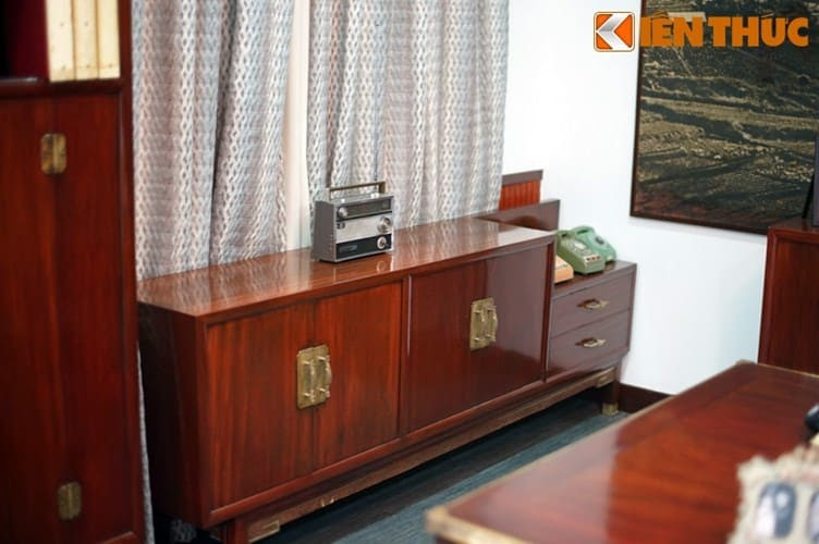 Chiếc tủ gỗ bên trái bàn làm việc.